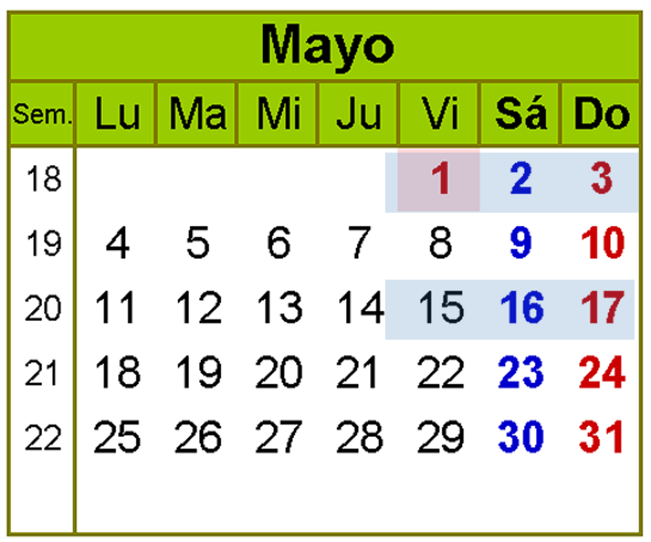 En el mes de mayo, en los fines de semana largos marcados, la entrada será el jueves a partir de las 17:00 y la salida el domingo antes de las 14:00.